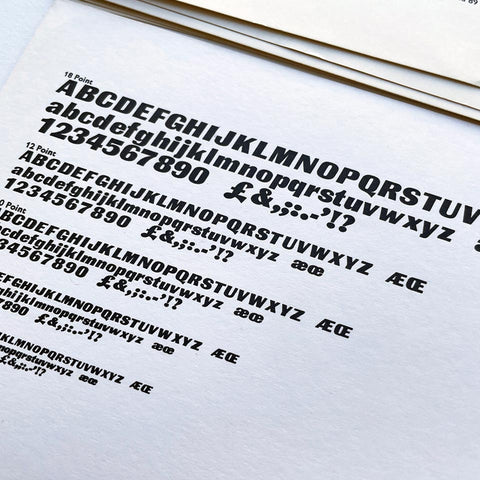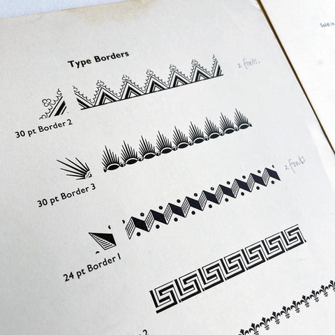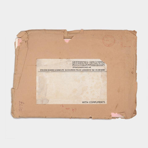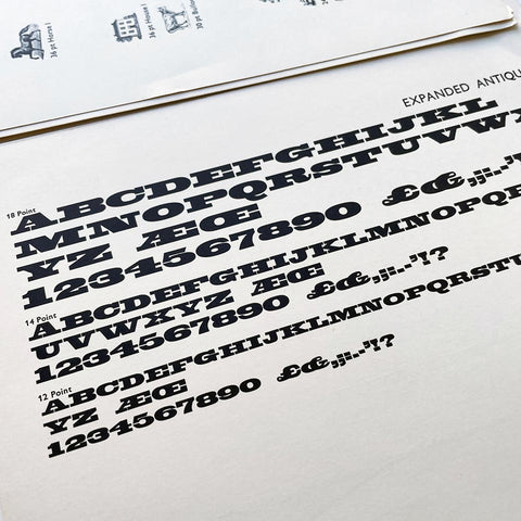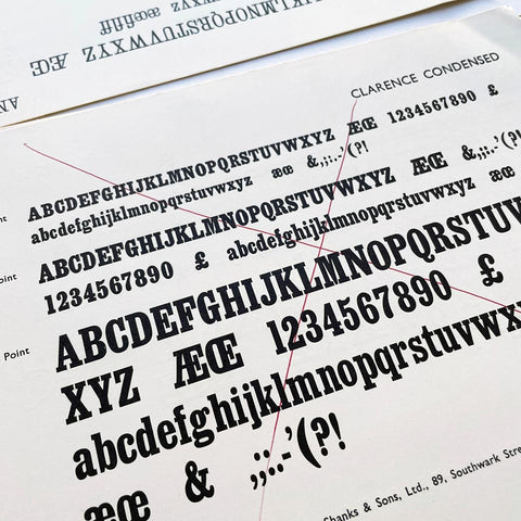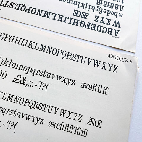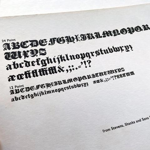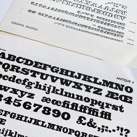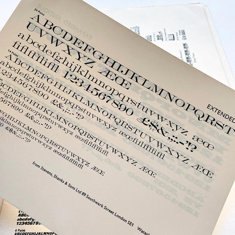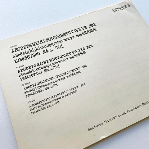 Fonts in Use reports that the “English foundry Stevens, Shanks & Sons was formed in 1933 after merging P.M. Shanks and Sons with Figgins.” And that’s all we know about this foundry because we’ve not done any more research. We’ve just looked at what’s in front of us. We count nine cards with full-alphabet showings of historic metal types. We’re talking Antique 3 and Antique 5 and Clarence Condensed and Figgins Shaded and Antique 6 and so on. (We’re looking at the figure 5 in Antique 6 right now. It is bonkers at 36-point, but reasonable at smaller sizes. [ Also check out the X in Antique 6.]) Anyway, a bunch of types that’re no longer available. That’s what these are—plus a small pile of correspondence related to purchasing type from London and shipping it to Central Massachusetts in the 1970s. No email or downloading of files. Just letters and paper.
