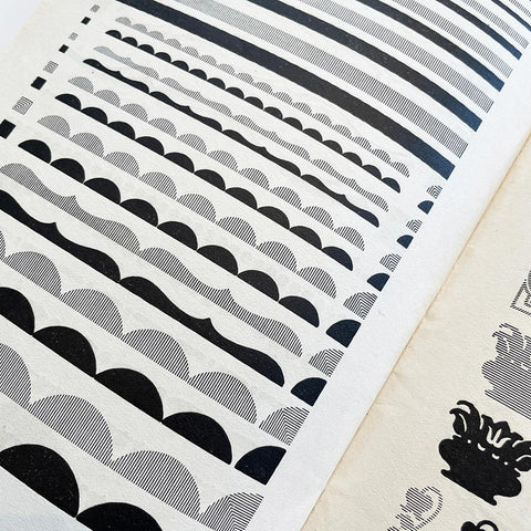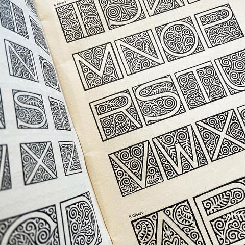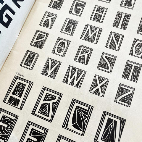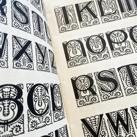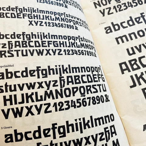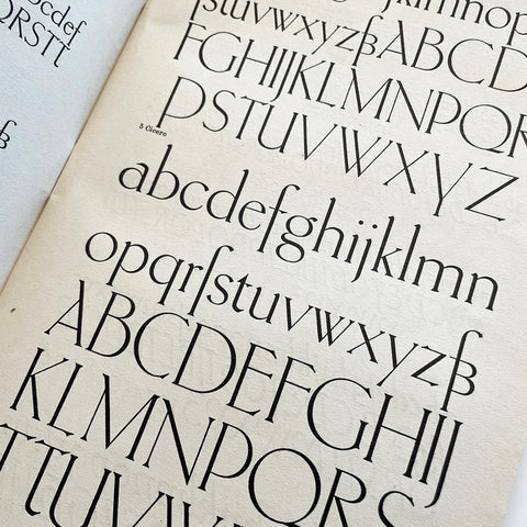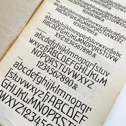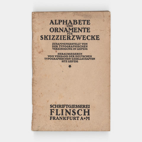 We’re of the opinion that modest publications are the best. Take this one as an example. It’s just cheap paper and astapled binding. It was just made to get a job done—and as such, it was used and there are no copies to be found anywhere in the U.S. But inside is a showing of typefaces from Schriftgiesserei Flinsch, the Frankfurt-based foundry that put out modern (for its time) faces. This is a showing of types released between 1905 and 1912. It’s nice in that is has full showings of large sizes. (The Wiener-Initialen is especially spectacular.) But are these showings large and complete because the title translates to “Alphabets and ornaments for sketching purposes”? Were printers meant to trace the types for mocking up layouts? That would certainly explain the couple of ghost letters where it looks like someone traced some letters with carbon paper (or whatever they had back then) going the wrong way. There’s a lot to steal and learn from here as it was made for stealing from. A lovely thing not made to be lovely. Include various weights (where applicable) of: