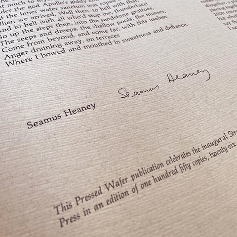 It’s April 6 in the year 2000. Seamus Heaney is in town after he won the Nobel Prize in Literature. Stratis Haviaras is always in town. Seamus is giving a reading at a lecture series named after Stratis. Our pals at Pressed Wafer aren’t yet our pals, but they ask our pal Katherine McCanless (before she was Katherine M. Ruffin, the author of this book) to produce a broadside to commemorate the occasion. Katherine set the two poems in Palatino and printed them on one sheet at the Bow & Arrow Press in a dank Harvard basement. Signed by both Seamus and Stratis, this one came to us (we think) from the staff at Pressed Wafer.