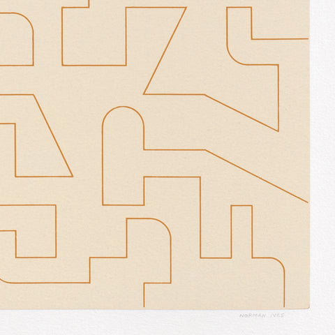 Long before Andy Warhol, artists had been enticed by the means of creating multiple images of their creations. Durer, Rembrandt, Matisse and Braque were masters of this extension of their art. As a student at Wesleyan University and at Yale University, Norman Ives showed an early interest in printmaking.* This 2-color screenprint is not student work, though. It’s a sophisticated showing by a mature artist and designer. A lovely meditation.