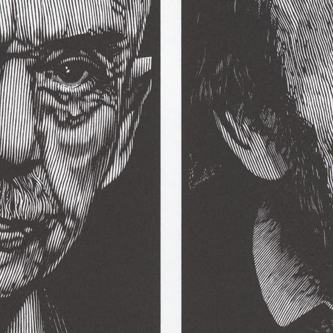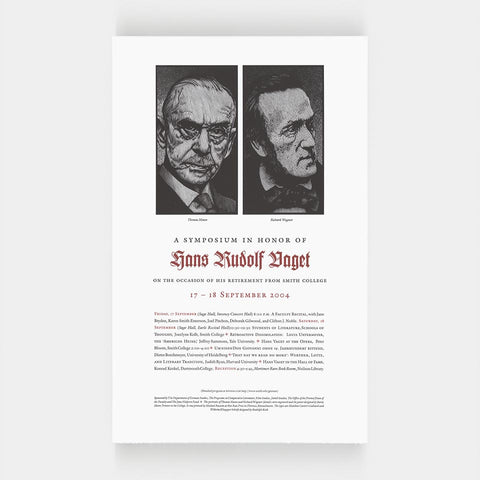 Remember when Hans Rudolf Vaget retired from Smith College and they held a symposium in his honor. Oh, man. For two days, a who’s who of Germaphiles gathered in Northampton, Massachusetts, to sprechen Deutsch. But more importantly, they had Barry Moser make portraits of Thomas Mann and Richard Wagner and then arrange them into this handsome poster. Letterpress-printed at the Kit Rin Press in nearby Florence, Mass, this one is accompanied by the tissue makeready made by the pressman to make sure the blacks were black and the whites were white. A nice thing with a rare artifact from the printing process. (Fun Fact: The printer was paid $825 [$1,400 in 2024 dollars] to print this poster plus a 4-page 2-color program for this event. We can’t figure out if that included the paper and plates. We’re guessing it did.)