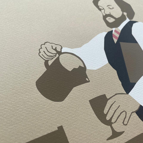 Picture this: Lance Hidy’s first-ever poster*—and it features our old friend David P. Bourbeau serving up a goblet of water with warmth and panache. It almost makes us want to get ourselves a vest. (We already have an apron.) With Lance’s handsome lettering and inviting composition, this 4-color silkscreen is a total charmer.