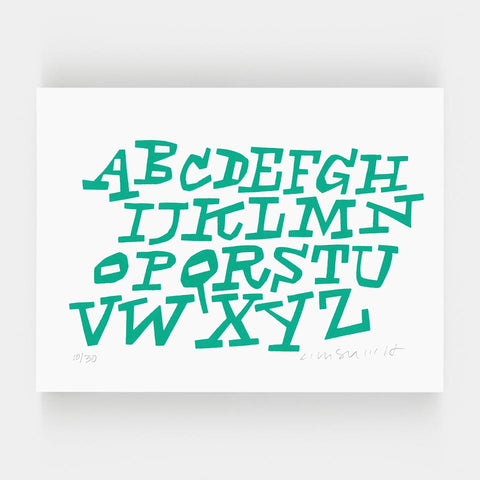 In November of 2023 Cyrus Highsmith had a show in Tokyo called Alphabet Zoo. It was a window into his graphic world. His playful creative process and the joy he gets from mechanical reproduction were on display in his collection of screen prints, monoprints, and etchings. Drawings of animals and the letters of the latin alphabet, pulled from the pages of his numerous sketchbooks, formed the basis for the series of images created for this exhibit. It’s an energetic and free-spirited collection of work. And this is one of the pieces from that collection. It’s a set of caps with serifs—and they’re greenish.