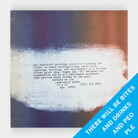 On Friday, November 14, Nat Pyper will talk about Come!Unity Press, an anti-capitalist gay anarchist printing cooperative based in Lower Manhattan in the 1970s. as our forty-fourth Standing-Room Only Lecture. You should come. But first you’ll need a ticket. There’s no need to print anything. Just give your name to the person at the door who gives off an air of authority or has a beard. (They’ll probably have a beard.)